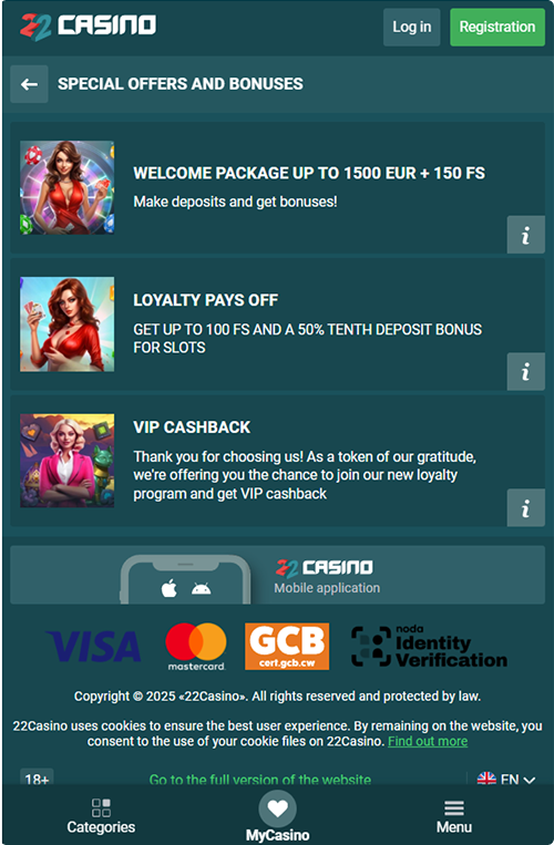 The first deposit you make will offer you a series of 22Casino bonuses. Welcome bonus, reload deals, and VIP perks make sure you have plenty of boosters along the way. The same range of games and deals is available across all devices.