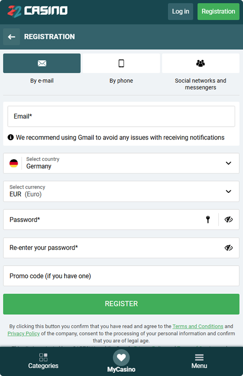 After all this praise, every player feels compelled to join 22Casino. The registration process is nothing to worry about, as it takes no more than a minute and five steps to complete:
